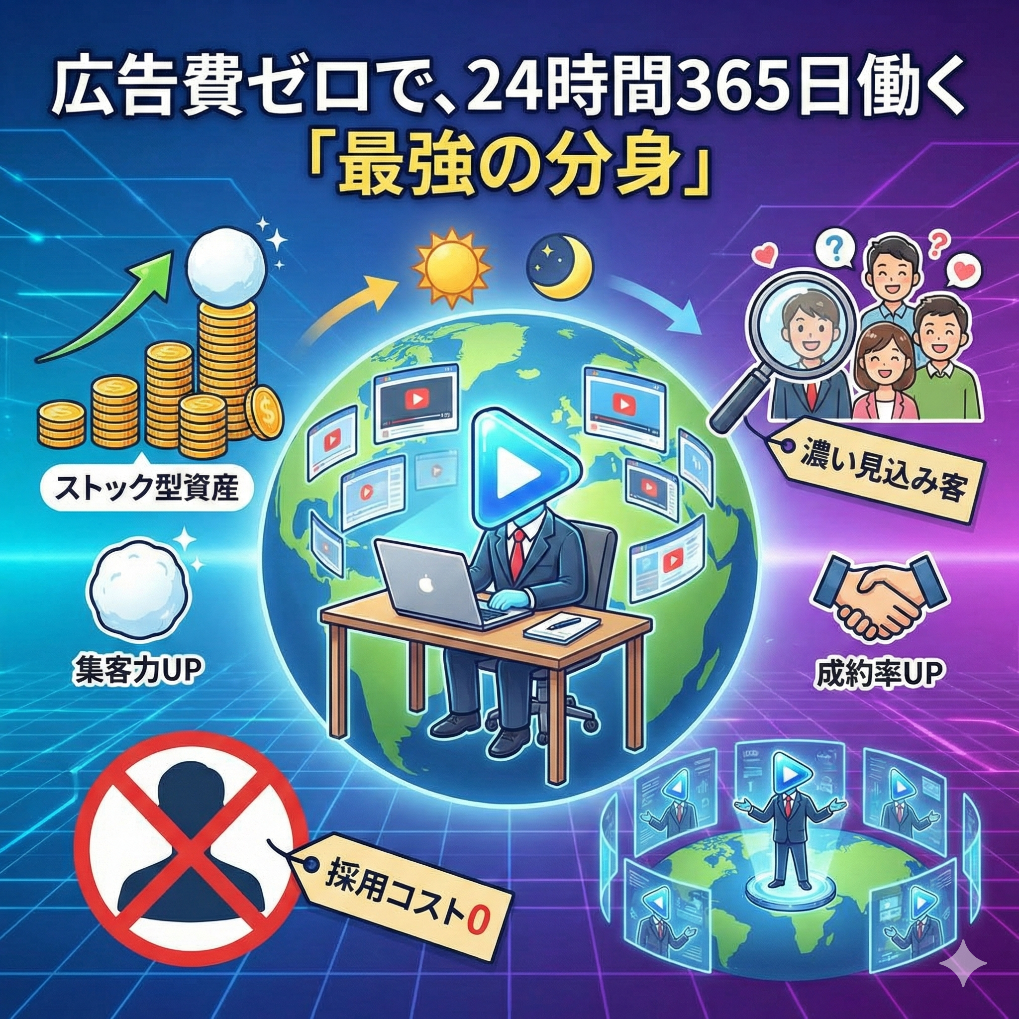 もう、一過性のWeb広告に高額な予算を投じたり、足を棒にして交流会を回る必要はありません。 一度構築された「動画資産」は、あなたが寝ている間も、家族と旅行を楽しんでいる間も、文句ひとつ言わずに働き続けます。