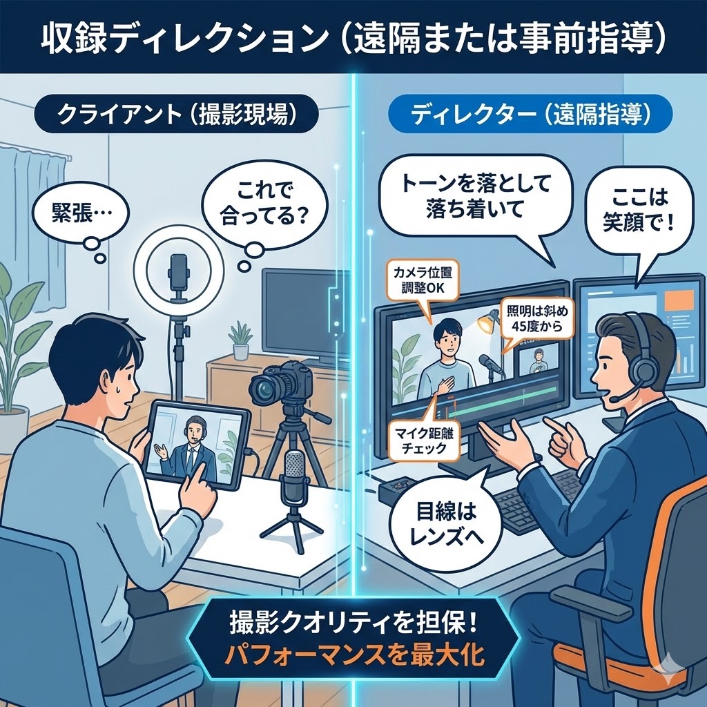 詳細: カメラのアングル、照明の当て方、マイクの位置などの環境設定はもちろん、「今の部分はもう少しトーンを落として」「ここは笑顔で」といった、演者としてのパフォーマンスを引き出すアドバイスを行います。
