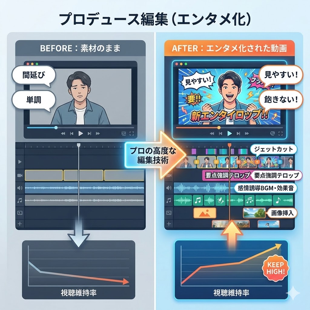 詳細: 無駄な間のカット(ジェットカット)、要点を強調するテロップ、感情を誘導するBGM・効果音、飽きさせないための画像挿入など、視聴維持率を高く保つための高度な編集技術を投入します。