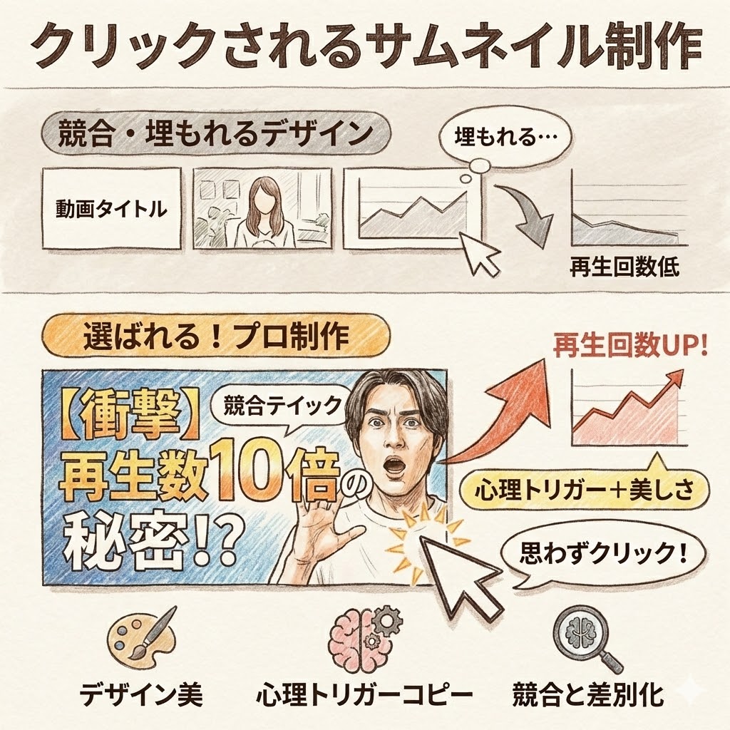 詳細: デザインの美しさだけでなく、「思わず押したくなる心理トリガー」を含んだコピーライティングを実施。競合のサムネイルと並んだ時に、埋もれずに選ばれるデザインを納品します。