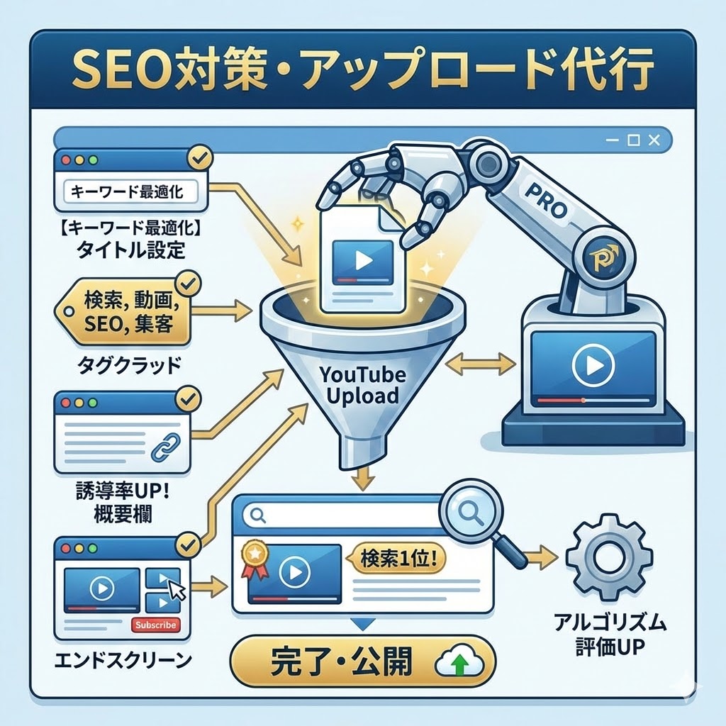 詳細: 検索されやすいキーワードを含んだタイトル設定、関連動画に乗りやすくするタグ設定、誘導率を高める概要欄の記述、終了画面の設定など、アルゴリズムに評価されるための細かな設定を全て完了させた状態で公開します。