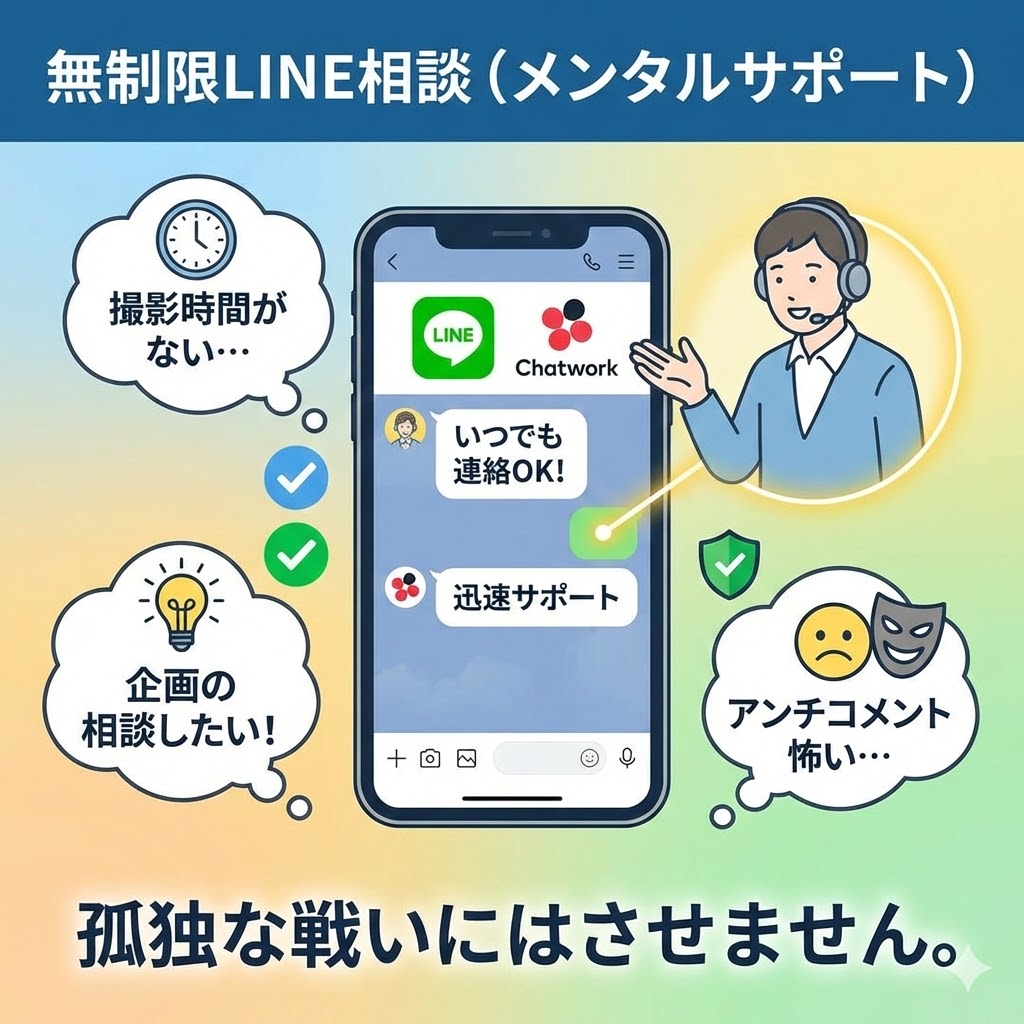 詳細: 「急に撮影時間が取れなくなった」「ふと思いついた企画を相談したい」「アンチコメントが来て怖い」など、運用中に発生するあらゆるトラブルや不安に対し、迅速に回答・サポートします。孤独な戦いにはさせません。