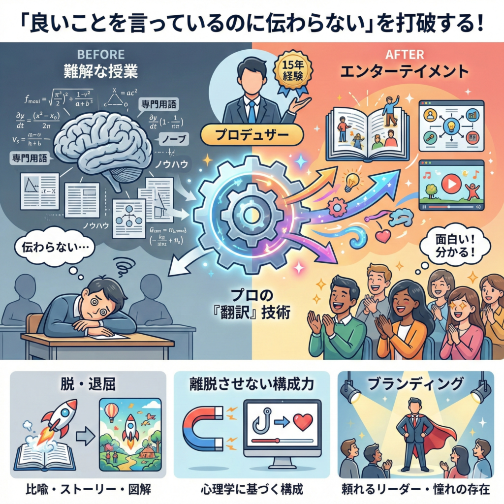 専門家であるあなたにとっての常識は、視聴者にとっての「難解な授業」になりがちです。 あなたの脳内にある高度な知識やノウハウを、映像制作歴15年のプロデューサーが、視聴者が直感的に楽しめる「エンターテイメント」へと『翻訳』します。