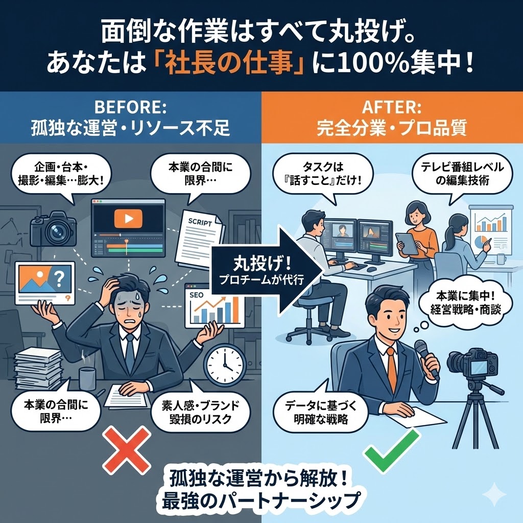 - 丸投げOK: あなたは「知識の提供」と「撮影」だけ。企画・台本・編集・分析はプロチームが担当します。