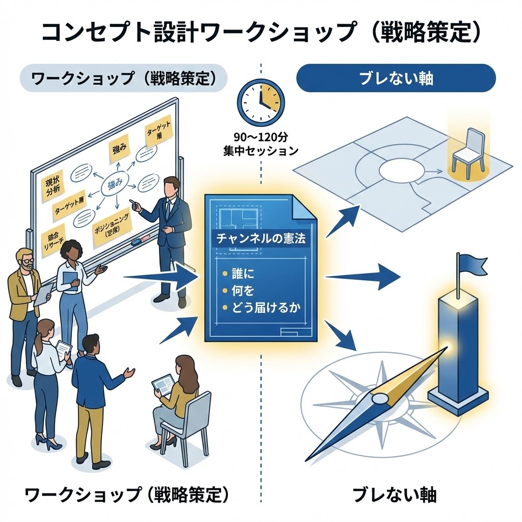 詳細: 競合チャンネルのリサーチを行い、「どの市場の空席を狙うか(ポジショニング)」を明確化。「誰に・何を・どう届けるか」というチャンネルの憲法を定め、ブレない軸を作ります。