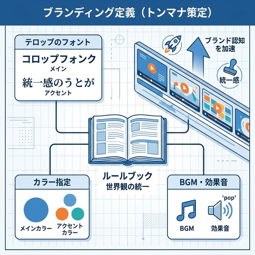 詳細: テロップのフォント種別、メインカラー・アクセントカラーの指定、BGMや効果音の選定など、細部まで規定。「いつどの動画を見てもあなたのチャンネルだと分かる」統一感を作り出し、ブランド認知を加速させます。