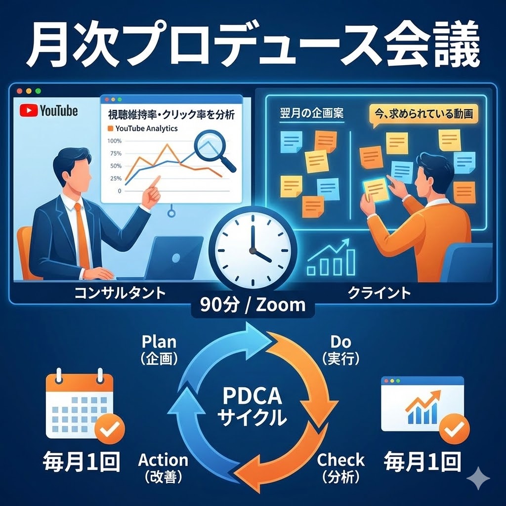 詳細: YouTubeアナリティクス(分析画面)を共有し、視聴維持率やクリック率を分析。「なぜ伸びたのか、伸びなかったのか」を解明し、PDCAを回します。そのデータに基づき、翌月の企画案をブレインストーミングし、「今、求められている動画」を決定します。