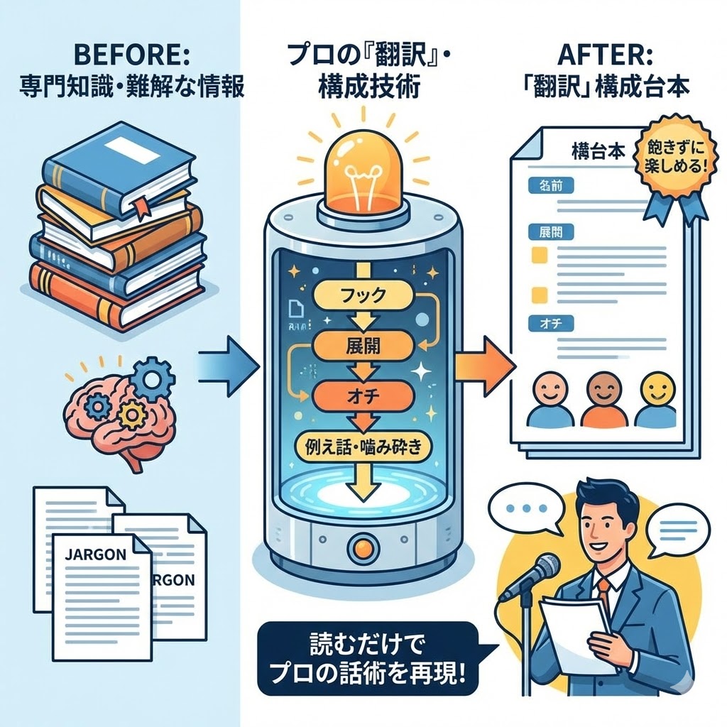 詳細: あなたの専門知識を、視聴者が飽きずに楽しめる構成(フック、展開、オチ)に「翻訳」します。専門用語の噛み砕きや、視聴者の興味を惹きつける例え話などを盛り込み、あなたは台本通りに読む(話す)だけで、プロの話術が再現できるように設計します。